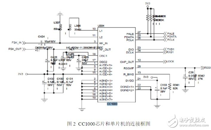 以下是CC1000芯片和单片机的连接框图和电路图: