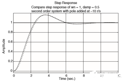 下图实线表示自然振荡频率ωn=1 radian/second, 阻尼因子ζ=0.5的阶跃响应曲线。虚线表示增加了额外高频极点-10 radian/second的阶跃响应曲线。可以看出这两个曲线基本重合,只是上升时间阶段,增加了额外极点的系统延时了0.1s,原因就是增加的高频极点带来的延时。