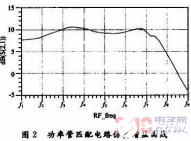 功率管的最高频率点F9附近容性特征比较明显,从仿真图也可以看出,在高频率点F9附近的增益较小。在增加带宽的情况下,损失了一部分的增益和效率。 2.3 制作匹配微带版图 根据仿真结果,该放大器的匹配电路版图,如图3所示。