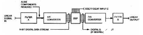 DSP滤波器的应用范围 DSP在数字化测量系统中有多种功能获得广泛采用,它们可改善有限取样率引起的频率响应、相位响应、噪声性能、带宽扩展等指标。数字化测量系统(如数字化仪、数字示波器)的DSP配置如图1所示,DSP对A/D转换后的模拟信号数据流进行数字处理,最常用的功能有快速傅立叶变换(FFT)、数字调制、增益控制、编码/解码等在数字通信中广为人知的运算,而在数字化测量系统中最重要的功能是数字滤波器,DSP滤波器作为软件滤波器能够提供比硬件滤波器更优异的特性。数字化测量系统对被测波形的数学运算即可使用有限冲激响应(FIR)滤波器,亦可使用无限冲激响应(IIR)滤波器,DSP滤波器可视为一种修改波形形状的数学程序。根据要求我们可设计出特定的滤波器,把波形变换成所希望的任何形状。因为从广义上来看,处理信号的任何系统都可视为滤滤器,以数字示波器为例,它的DC输入通道是低通滤波器,3dB滚降点就是它的频率带宽,在AC输入情况下它就是带通滤波器。DSP滤波器的主要应用如下: