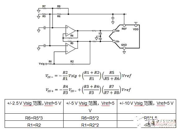 提供电平转换的差分转差分 该配置采用两个放大器,将一个输入信号电平转换至Vref/2的ADC共模电压。在此配置中,R1=R3,R2=R4,并且可针对增益或衰减配置。 R5和R6之比用来将信号电平转换至所需范围。 任意输入共模变化都会导致ADC输入共模的偏移,同时降低性能和信号摆幅。