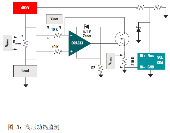 扩展功率监视器的共模电压范围高压系统(40V 至 400V)的系统优化和功耗监控若经过精确实施,可以改善系统功耗管理和效率。了解电流、电压和系统功耗信息有利于诊断故障或计算系统的总功耗。监控故障和功耗优化可防止过早出现故障并显著降低功耗(通过优化系统关闭和唤醒)。 图 3 说明了如何在支持 40V 至 400V 系统的应用中采 用 36V 共模电压功耗监控器件 INA226。图 2 显示了用于将分流电阻器上的感应电压镜像到精密电阻器 R1 上的精密轨至轨 OPA333 运算放大器。 OPA333 在其电源引脚之间使用 5.1V 齐纳二极管浮动高达 400V。 该运算放大器用于驱动电流跟随 器配置中的 600V PFET 的栅极。通过选择低泄漏 PF ET,即使在测量的低端也能获得准确的读数。R1 上的电压可设置 FET 的漏极电流。 通过使 FET 漏极中的电阻器 R2 匹配为等于 R1,R2 上将形成 VSEN SE 电压 (VR2)。INA226 电流监控器的输入端连接在 R2 上,用于电流检测。因此,该电流监控器不需要高共模能力,因为它只能检测到在 VSENSE(通常小于 100mV)左右徘徊的共模电压。INA226 是具有 I2C 接口的高精度电流/电压/功率监控器。 INA226 还可以检测小于 36V 的总线电压。由于此处使用的总线电压为 400V,因此采用分压器将高压总 线降压到 INA226 共模范围内的电压。采用 64 的比率后,总线电压的最低有效位 (LSB) 可以相应地增减, 以获得实际的总线电压读数。在这种情况下,您可以使用修改后的 80mV LSB。为分压器选择精密电阻器有助于保持总线测量精度。