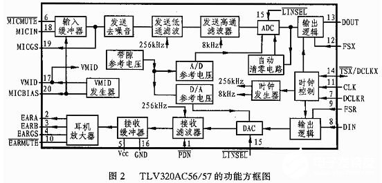 TLV320AC56/57集成电路有压展和线性两种工作模式。在压展工作模式下,数据的发送和接收均为8位;在线性工作模式下,数据的发送和接收为16位,另3位用于衰减控制,也可填充三个“0”。 发送部分可直接与驻极体话筒接口,以将话筒信号送给缓冲放大器变固定电平信号,然后再经去噪后送给带通滤波器。在压展工作模式下,滤波器输出信号应送给压展A/D转换器。 接收部分有压展和线性两个D/A转换器,分别用于转换从DIN输入的串行数据。所得的模拟信号送到隔离电容滤波器以滤除带外信号。滤波器同时提供(SinX)/X校正以使信号平滑。其输出信号将直接供给耳机放大器,该放大器的增益是可调的,并能提供低功耗的差分输出。 TLV320AC56/57内有一带隙高精度电源电路,参考电压VMID等于Vcc/2,对放大电路和话筒偏置提供相当于1/2电平的虚地,另一参考电压可为MICBIAS提供话筒的电流偏置。图2是它的功能方框图。