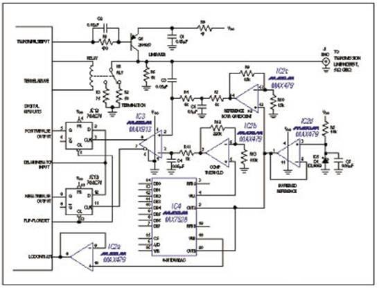 图8 在这种情况下,用DAC和比较器(b)替换ADC(a)可降低系统成本、响应时间以及软件开销 另一方面,为支持ADC,处理器在跳转到关断子程序之前必须轮询ADC、输入采样值并与先前设定值进行比较。这样,DAC/比较器不仅节约成本,而且提供了比采用ADC的更快响应;同时还减小了处理器开销。 时域反射计 最后,低成本、低功耗DAC/比较器组合(相对于ADC)在便携式时域反射计(TDR)中非常实用,后者是一种用于检测电缆的不连续性并可测量中间传输长度的仪器。廉价的便携式TDR随着网络电缆的增加变得非常普遍。 TDR工作原理类似于雷达,沿着线缆发送一个主脉冲并监测由开路、短路、或者其它电缆阻抗不连续产生的反射。发射脉冲及其反射波传输延时间隔大约为每英尺3.3ns,假设线传输速率为0.6c(光速的十分之六)。那么,在电子学上10ns时间分辨率可分辨出大约3英尺距离的不连续性。 接收到的脉冲幅度和发送脉冲幅度的比用于计算反射系数。知道反射系数和电缆阻抗就可以计算不连续阻抗,从这些信息可推断出不连续的原因。同轴电缆在反射回路上对脉冲的衰减使其变得复杂,因此,软件必须对此进行补偿,通常根据测量距离施加一个幅度修正。 本应用中的ADC必须每个5ns转换一次(200Msps)。尽管厂商可以提供这种ADC,但价格非常昂贵,而且功耗大,通常不适合便携式应用。 实际应用中的手持式TDR模拟前端(图9)能够说明上述观点。为了便于说明,这里没有包括数字电路。尽管简单并且没有特殊元件,该电路仍具有很好性能。能够可靠地测量端接阻抗并且对于500英尺长的电缆具有5%测量精度。可测量长达2000英尺的开路或短路故障。重要的是,系统(包括显示和数字电路)可在9V碱性电池下工作长达20小时。