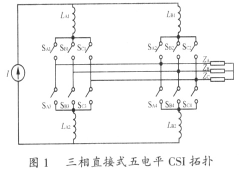 引言 现有的关于多电平变流器的研究工作主要是针对电压型变流器(Vohage Source Inverter,简称VSI),对电流型变流器(Current Source Inverter,简称CSI)研究还较少。这不仅是因为通常的电力能源例如发电机,电网,电池等均属电压源,而且VsI中的储能元件电容器与CSI中的储能元件电感器相比,储能效率和储能元件的体积、价格都具有明显的优势。但是,随着超导技术的发展,将解决电流型变流器中电感的储能效率问题。和VSI相比,CSI也具有自己的特点,它便于实现四象限运行,而且工作更加稳定,输出电流更加容易控制等。因此,在有源滤波(APF)、无功补偿(SVG)以及电力系统中,应用将会越来越广泛。对于多电平逆变器而言,PWM技术无疑是一种获取理想输出的方案。总体上来讲,适用于多电平VSI的控制策略同样适用于多电平CSI,但对于不同的拓扑应采用相适应的控制策略。对于组合式多电平CSI,各个单元CSI在控制上相对独立,因而便于采用PWM技术。对于直接式多电平CSI,不能简单沿袭常规的调制方法,通常,三相多电平CSI在选取控制策略时必须考虑以下因素: 1)要维持直流侧电流的持续导通; 2)要保证分流电感的电流平衡; 3)要考虑到三相电流的相互耦合影响。 1 、电路拓扑分析 图1是本文介绍的三相五电平CSI拓扑(以下称为直接式三相五电平),每个开关器件由MOS管和一个快恢复二极管串联。在稳态时,考虑到电路拓扑的对称性并忽略电感的纹波,则在分析电路时图中可用值为1/2的电流源来代替每个均流电感。如图2所示,它的输出电平为一I,一I/2,0,1/2.I五电平。