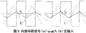 图5所示的为放大器内部环路信号,VE为积分器的输出波形,VT为振荡器的输出波形,这两个三角波互相穿通,输出改变方向。为了使这个音频功率放大器能够正常工作,这个振荡器三角波的幅度应该比积分器输出三角波的幅度大,更为准确性的说是振荡器三角波的斜率应该比误差三角波的斜率大,否则就会出现发散的现象: