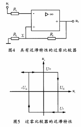 2.2 TS391作为迟滞比较器 图4为具有迟滞特性的过零比较器。从输出端引一个电阻分压正反馈支路到同相输入端,若u0改变状态,∑点也随着改变电位,使过零点离开原来位置。当u0为正(记作U+),则当ui》U∑后,u0即由正变负(记作U-),此时U∑变为-U∑。故只有当ui下降到-U∑以下,才能使u0再度回升到U+,于是出现图5中所示的迟滞特性。-U∑与U∑的差别称为回差。改变R2的数值可以改变回差的大小。