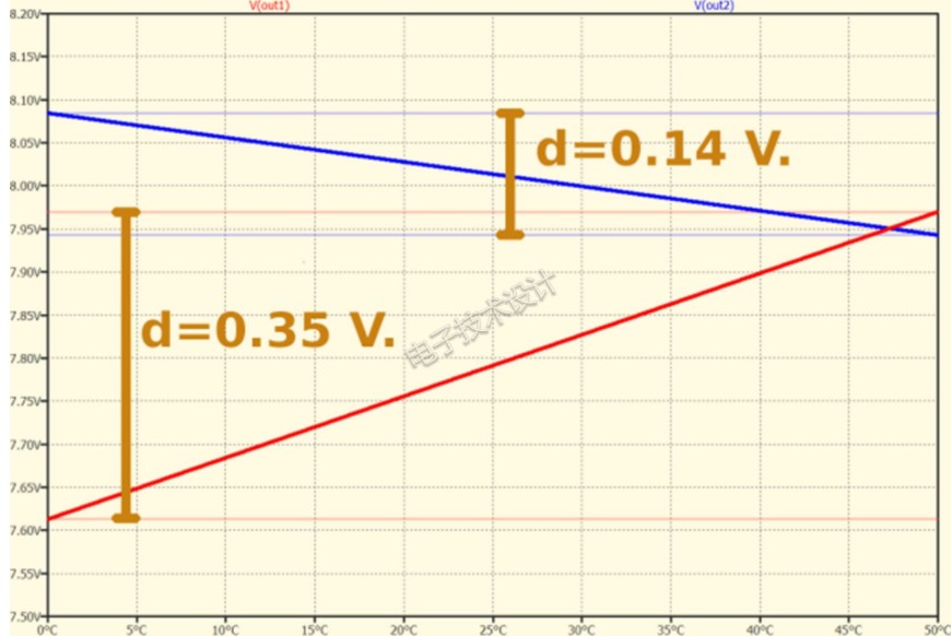 测量电压偏移随温度的变化 第二个电路大大提高了稳压器的性能,而使其几乎不受温度变化的影响。现在来检查一下两个电路上的热效应,并检查一下输出端的电压变化。图3显示了在上述条件下两个电路的静态工作情况。此仿真是在0℃到+50℃的温度范围内进行的。从两条曲线可以看出,两个稳压器的输出电压会随热量条件而发生变化。特别是,图中的测量数据显示了以下详细信息: 红色曲线表示在0℃到50℃之间的变化工作温度下负载为100Ω的第一个电路的输出。可以看到输出电压逐渐呈线性增加,在0℃时为7.61V,在50℃时为7.96V,最大总偏移量为0.35V。因此,第一个电路完全受温度的影响。 蓝色曲线表示在0℃至50℃的变化工作温度下负载为100Ω的第二个电路的输出。在0℃时,可以看到输出电压逐渐呈线性下降。在80℃时为8.08 V,在7.94V时为0.14V,最大总偏移量为0.14V。因此,第二个电路完全不受温度影响,受热量变化的影响要小得多。