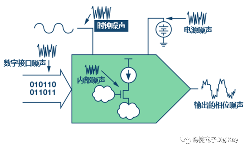 图1:DAC相位噪声来源 (图片来源:ADI) 其中最重要的两个来源是时钟噪声与电源噪声。本文将主要介绍时钟噪声对于DAC相位噪声的影响。 深入了解ADI的DAC芯片产品 请点击这里 时钟相位噪声的产生 DAC时钟是DAC中产生相位噪声的首要原因。时钟决定何时发送下一样本,故相位(或时序)中的任何噪声都会直接影响输出的相位噪声。