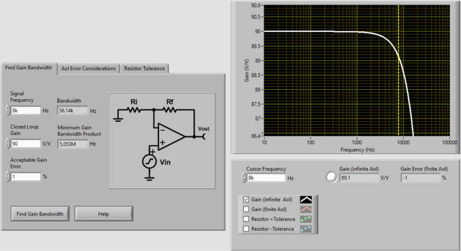 其中,f signal是输入信号频率(示例中为 8 kHz),G DC是电路的噪声增益(示例中为 90 V/V),G最大频率是具有允许误差的电路的噪声增益(示例中为 89.1 V/V)。 由于公式 1 很复杂,德州仪器 (TI) 开发了一种计算器工具,称为增益误差与带宽计算器,位于模拟工程师计算器中。下载该工具,启动它,单击放大器和比较器旁边的加号按钮,然后单击增益误差与带宽。 在计算器的第一个选项卡(称为查找增益带宽)中,插入以下值: 8k (Hz) 信号频率 90 (V/V) 用于闭环增益 1 (%) 为可接受的增益误差 单击“查找增益带宽”将为您提供大约 5 MHz 的最小增益带宽乘积。如果您选择带宽约为 5 MHz 的运算放大器,您可以预期在 DC 时看到 90 V/V,在 8 kHz 时看到 89.1 V/V,如图2 中的频率响应图所示。