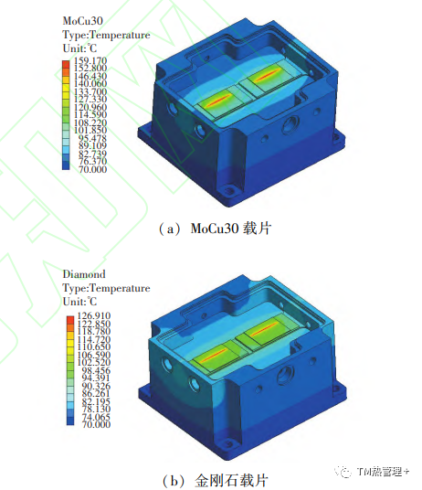 图 4 采用不同载片的放大器的温度场分布仿真结果 3 测试验证 3.1 红外测试结果 为提高测量精度,利用同一台红外热成像仪对功率放大器结温直接进行测试,以减小测试误差。测试过程使用与有限元仿真中相同的工作条件,图5 为分别采用 MoCu30 载片和金刚石载片的两种放大器的表面温度分布热成像。由图可见, MoCu30和金刚石载片封装器件的芯片结温分别为160.60 ℃和 130.59 ℃ ,采用金刚石载片的芯片结温较 MoCu30 载片的降低了30.01 ℃ ,约 18.69%,与仿真结果趋势一致。