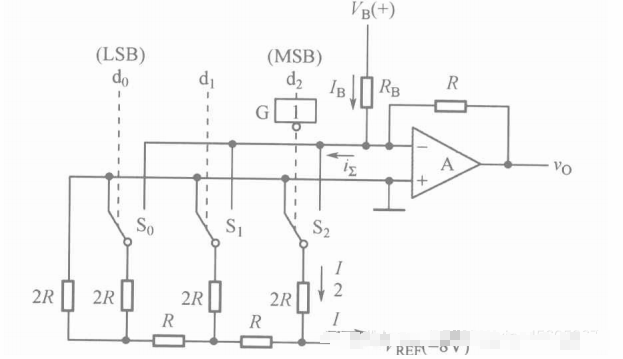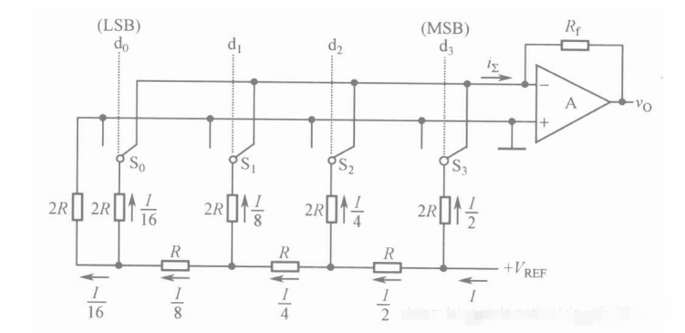 这其中d i 的值可以为0或1,表示开关的打开与闭合,之后通过一个求和放大器输出相应的模拟量。 因为是反相放大器,故推导过程如下: