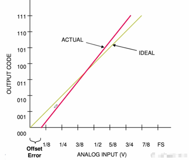 图2 失调误差 7.增益误差 ADC实际传输曲线斜率偏离理想斜率的程度。即补偿了失调误差之后,输出曲线最后的实际偏差。