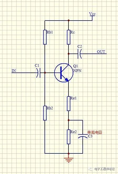 在模拟电路中,我们最终需要面对的是信号。这是模拟电路最神秘,也是难度最大的地方。 文章从实例出发讲解,内容较长,请慢慢品读 共射极放大电路 共射极放大电路在电子电路中应用非常广泛,常用于小信号放大(电压放大)。它是一类输入阻抗较大(几千到几十千欧姆),输出阻抗较小(几百到几千欧姆)的放大器。它的基本电路如下 上图的偏置电路难以调试,且放大倍数受三极管温度影响巨大,作者能力有限,所以不去讨论如何设计,而改用稳定性更好的偏置讨论 为什么叫做共射极放大电路? 共射极指的是输入和输出的交流信号共同的通路是流经三极管的射极(E极)后流回源头的放大电路。如图绿色箭头表示的是输入信号的流向,红色箭头表示的是输出信号的流向,它们共同经过三极管射极 信号流向 交流等效电路和直流等效电路 在实际设计之前,我们先学习一下三极管放大电路的等效电路,它们的特点如下 对于直流等效电路,电容相当于开路(隔直通交) 对于交流等效电路,电容相当于短路,电源正负极相当于短路,引入发射极本征电阻re‘ = 25/Ic(mA),发射极本征电阻受三极管温度影响,发射极本征电阻和发射极串联 共射极放大电路 直流等效电路 交流等效电路 无旁路电容的共射极放大电路 特点:稳定性好,但放大倍数较低 共射极放大电路 直流等效电路 交流等效电路 交流等效电路 实例: 输入信号幅度1V,频率1000Hz~20000Hz 要求:输入阻抗大于10kΩ,输出阻抗大于1kΩ,电压放大倍数5倍 电源电压的设定:因为输入信号幅度为1V,电压放大倍数为5倍,放大后电压幅度为5V,所以电源电源需大于5V,选择10V,如果选择接近5V非常容易失真 输出信号的静态电压(C极对地电压):VCC / 2 = 10V / 2 = 5V 输出静态电压设定在电源电压的一半时,即能保证放大信号不失真,因为输出最大电压等于5+2.5V等于7.5V,最小电压等于5-2.5 = 2.5V 电阻Rc的确定:根据交流等效电路可以看出,输出阻抗等于Rc,所以Rc = 1kΩ 电阻Re的确定:电压放大倍数Av = RC/(re’+Re),电压放大倍数为5,则re‘+Re = Rc/Av = 1kΩ/5 = 200Ω, re’ = 25/Ic(mA) = 25/(URc/Rc*0.001) = 25/(5V/1KΩ*0.001) = 5Ω, 则Re= 200Ω-re‘ = 195Ω 输入信号的静态电压(B极对地电压):首先三极管E极对地电压Ue = Ie * Re ,而Ie约等于Ic,所以Ue = Ic * Re = 5V/1kΩ*195Ω = 0.975V,三极管BE极电压降等于0.7V,所以三极管B极电压Ub = Ue+Ube = 0.975V + 0.7V = 1.675V 电阻Rb1和Rb2的确定:从直流等效电路可以看出,三极管B极电压等于Rb1和Rb2的分压,首先随便确定一个电阻的值先,比如Rb2 = 16.75KΩ,则Ub = VCC * (RB2/(Rb1 + Rb2)) = 1.675V,求得Rb1 = 83.25KΩ 输入阻抗:根据交流等效电路可看出,输入阻抗等于Rb1//Rb2//(HFE*(re’ + Re)) = 16.75kΩ//83.25kΩ//(200*(5Ω+195Ω) ) ≈ 10.33KΩ 两条横杆//是并联的意思 输入电容和输出电容:输入电容和输入电阻构成一个RC高通滤波器,输出电容和输出电阻构成一个高通滤波器,根据高通滤波器公式f = 1/(2πRC)可求出在最小频率处,信号不衰减时的电容值为:输入电容应大于15nF,输出电容应大159nF 参数 射极电阻全旁路的共射极放大电路 特点:稳定性差,放大倍数大 共射极放大电路 直流等效电路 交流等效电路 实例: 输入信号幅度0.01V,频率20Hz~10000Hz 要求:输入阻抗大于10kΩ,输出阻抗大于2kΩ,电压放大倍数50倍 电阻Rc的确定:根据交流等效电路可以看出,输出阻抗等于Rc,所以Rc = 2kΩ 电源电压的设定:因为输入信号幅度为0.01V,在交流等效电路中可以看到,射极电阻Re已经被旁路掉了,所以电压放大倍数Av = Rc/re‘ 则re’ = Rc / Av = 50/2000Ω = 40Ω 而re‘ = 25/Ic (mA)计算Ic = 25/40Ω = 0.625mA 又因放大电路把Vcc的一半设计成输出静态电压,所以Vcc = Rc*Ic*2 = 2000Ω*0.000625A*2 = 2.5V 电阻Re的确定:电阻Re根据经验一般选择为1/10Rc = 2000Ω*1/10 = 200Ω 输入信号的静态电压(B极对地电压):首先三极管E极对地电压Ue = Ie * Re ,而Ie约等于Ic,所以Ue = Ic * Re = 1.25V/2kΩ*200Ω = 0.125V,三极管BE极电压降等于0.7V,所以三极管B极电压Ub = Ue+Ube = 0.125V + 0.7V = 0.825V 电阻Rb1和Rb2的确定:从直流等效电路可以看出,三极管B极电压等于Rb1和Rb2的分压,首先随便确定一个电阻的值先,比如Rb2 = 8.25KΩ,因Ub = VCC * (RB2/(Rb1 + Rb2)) = 0.825V,求得Rb1 = 16.75KΩ 为了充分的把交流信号旁路(就是不经过电阻Re),旁路电容的容抗要大于10倍Re,有公式Xc 》= 10Re 容抗公式为Xc = 1/(2πfc),合拼得C 》= 5/(πfRe) 求得旁路电容需大于等于398uF,此处f为最小输入频率 输入阻抗:根据交流等效电路可看出,输入阻抗等于Rb1//Rb2//(HFE*re’ ) = 8.25kΩ//16.75kΩ//(200*200Ω ) ≈ 4.856KΩ 两条横杆//是并联的意思 参数 射极电阻部分旁路的共射极放大电路 特点:较稳定,放大倍数适中 共射极放大电路 直流等效电路 交流等效电路 把这留给你们计算设计吧,前面两个理解了这个也不难,只看是没有用的,实际去尝试才能学到东西 输入信号幅度0.5V,频率100Hz~5000Hz 要求:输入阻抗大于10kΩ,输出阻抗大于1kΩ,电压放大倍数20倍 提示:电压放大倍数Av = Rc/(re‘ + Re1) Rc等于10倍(Re1+Re2 ) 旁路电容容抗大于10倍Re2 答案明天会在评论里面公布的,加油哦 总结 三极管放大倍数不稳定主要是受到射极本征电阻的影响,因为re’ = 25/Ic(mA)这个值是受温度影响的,要想稳定高就得牺牲放大倍数,还有一点就是输出信号和输入信号反相! 三极管共射极放大电路就先讲到这里了,谢谢大家的支持!!! 答案: 电源电压的设定:因为输入信号幅度为0.5V,电压放大倍数为20倍,放大后