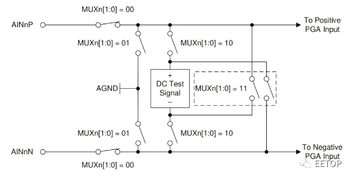 图3.显示 ADS131M06 输入多路复用器。图片由TI提供 如您所见,其中一个多路复用器配置 MUXn[1:0] = 01 将两个输入都短路到地。此多路复用器配置可用于失调校准。另一方面,一些ADC仅断开其中一个输入与外部电路的连接。例如,考虑AD7124-4的内部连接,如图4所示。