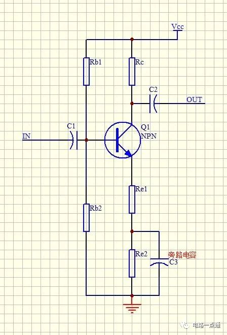 信号流向 交流等效电路和直流等效电路 在实际设计之前,我们先学习一下三极管放大电路的等效电路,它们的特点如下 对于直流等效电路,电容相当于开路(隔直通交) 对于交流等效电路,电容相当于短路,电源正负极相当于短路,引入发射极本征电阻re' = 25/Ic(mA),发射极本征电阻受三极管温度影响,发射极本征电阻和发射极串联