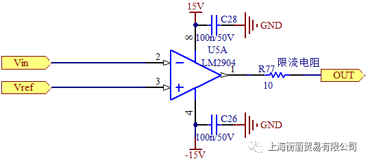 如下图,依然是电压比较器结构,上面已经提到,运放开环增益很大,不带负反馈,工作就如非线性区,当做电压比较器来使用。