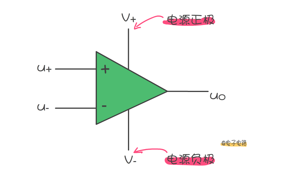 从运放上面的符号可以看出,运放有两个输入端,一个输出端。那么运放的要不要电源供电的?当然是需要电源供电的。一般情况下运放的电源引脚可以不画
