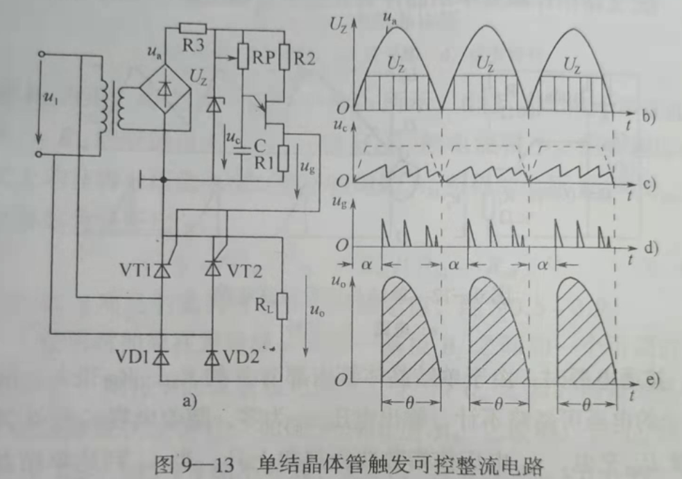Ug为输出电压,由于单结晶体管两基极电阻很大,则R1上边的压降可以忽略不计,输出电压为零。 接通电源后,电源为电容C充电以后,电容电压不断上升,当达到单结晶体管发射极峰点电压时,发射极和第一基极之间的PN结导通,电容对RB1、R1放电,电流注入RB1然后其阻值迅速下降,这样C仅通过R1放电。R1的电阻值远远小于电阻R,所以充电比放电要慢,当随着放电电压下降到谷点电压时,提供不了谷点电流给单结晶体管,又电源提供给第一基极的电压UB1高于发射极电压,PN结反偏关断。电容由R再度充电,产生第二次触发,如此循环反复,便在R1上输出周期性脉冲串。于是在R1上形成尖峰型脉冲电压。(b图下电压Ug) 改变可调电阻R的阻值,可以改变充电时间常数,从而改变脉冲周期,把电阻R1换成扬声器,调节R阻值使发出类似蝙蝠的叫声,可作为驱蚊器使用。此处为晶闸管触发电路。 单结晶体管触发的可控整流电路