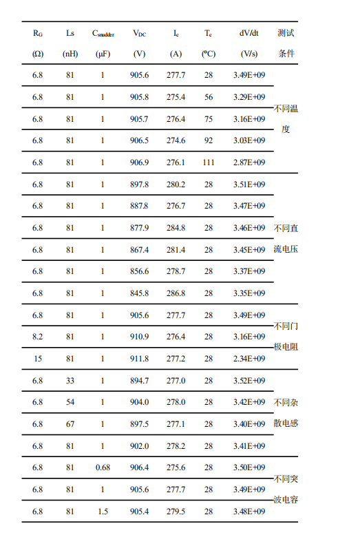 ![]() 表1. 不同因素及结温与dv/dt的关系