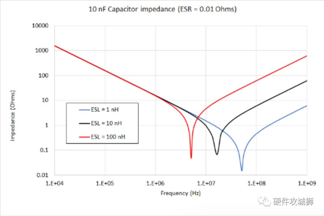 由于电容器中的介电材料具有很强的绝缘性,因此 Rbulk 的值通常非常大(~100 GOhms),因此在计算电容器的阻抗时可以忽略它。因此,我们在选择电容时需要重点关注ESL和ESR值。 (3)ESR和ESL对于电容滤波作用的影响: ESR:——会导致电压突变! ESR通常是在100mΩ ~ 1000mΩ不等,假如你的芯片电源会有一个非常短暂的100mA的peak current, 而且这个电流几乎是去耦电容来提供的, 如果你的电容ESR有1Ω,想象一下100mA的电流流过这个电阻, 到达另一端的时候, 已然有了100mV的压降了. ESL——会影响滤波的工作频率和高频滤波效果。 下图显示了 ESL 如何影响具有 0.01 欧姆 ESR 的理论 10 nF 电容器的阻抗。各种曲线显示了不同 ESL 值(1 nH、10 nH 和 100 nH)的阻抗曲线。