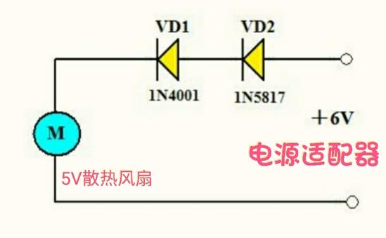 利用多个二极管串联可以将直流电压降低到所需的电压,并且这种降压方法输出的电压较稳定,发热量也比用电阻降压小得多。 上图电路巧妙利用二极管的正向压降降压,来给一个5V的散热风扇供电。电路的输入电压是一个6V的电源适配器。VD1为硅整流二极管,其正向压降约为0.7V,VD2为肖特基二极管,其正向压降约为0.25~0.3V,两个管子串联使用,正好可以将6V电压降低1V。由于VD1、VD2的整流电流皆为1A,本电路不论电机的工作电流是0.1A还是0.8A,两个二极管两端的正向压降基本稳定在1V不变。若采用电阻降压,负载电流不同时,电阻两端的电压亦会发生变化,从而使电机两端的电压不稳定。 文章整合自:花落尘埃d1y8s0、chat.forchange (责任编辑:admin) |