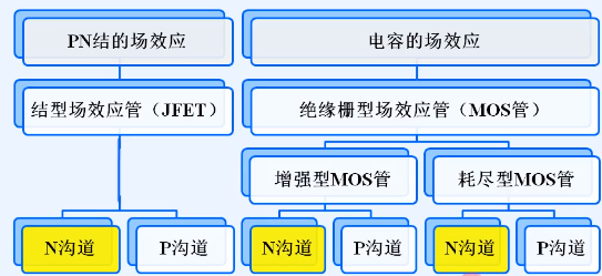 一、场效应管分类 1.两类电场效应 场效应管:场效应晶体管 ①PN结耗尽层宽度随反向电压变化的场效应 在PN结施加反向电压,耗尽层会逐渐变宽,通过改变耗尽层宽度来对导电通道进行控制。 ②电容正负电荷吸引力构建导电通道的场效应 当在电容左基板上施加正电荷,P型半导体的自由电子会向左侧运动,随着左侧基板电压增大,自由电子会在P型半导体左侧汇集,当电压增加到一定程度,P型半导体左侧区域会形成反型层(P型半导体的多子时空穴,而这里自由电子较多,所以称为反型层)