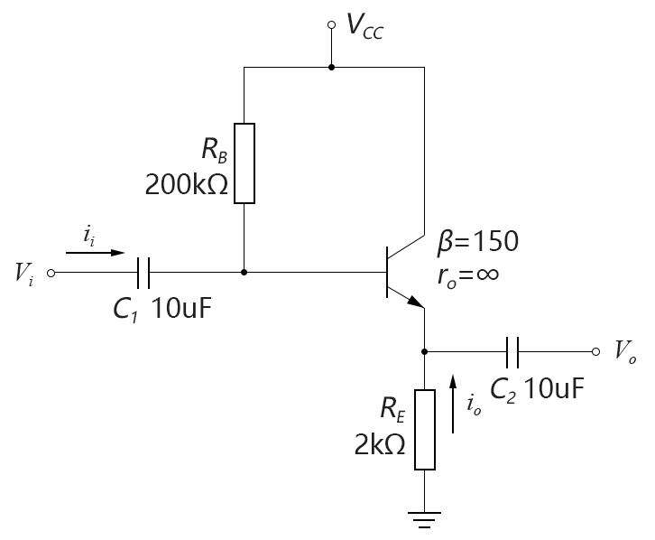 共集放大电路的公共端为集电极,输出信号Vo从射极取出。且由于共集放大电路的电压放大倍数Av近似于1(即输出电压等于输入电压),因此常被称作射极跟随器(emitter-follower)。由于共集放大电路和共射放大电路的形式非常类似,仅仅是从不同的极取出输出信号,因此也有:固定偏置、分压偏置等不同形式的电路。 射极跟随器的作用主要是用于阻抗匹配(impedance-matching)。它的输入阻抗非常高、且输出阻抗很低(与固定偏置共射放大电路的特点正好相反),因而可以在多级放大电路中,作为中继来使用,使得电路达到比较理想的输入输出效果。 1. 固定偏置 典型的固定偏置的射极跟随器电路如下图所示: