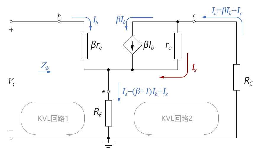 图4-06.04 上图中,为分析简便起见,我们先不考虑输出电阻ro的影响,将其视为无穷大(因为在有射极电阻RE的情况下,在re模型中加上ro后,会使电路的计算复杂度大大增加,不利于我们概念的说明,后文我们会专门讨论当考虑ro的影响时如何计算)。 ● 输入阻抗: 这里输入阻抗直接用Vi/Ii的公式进行强推比较困难,我们可以先作一下变通,先求出不含RB时,直接从BJT输入端看入的“仅BJT的输入阻抗”Zb,然后再用Zb和RB并联即可得到整个电路的输入阻抗Zi。 对BJT的输入端列写KVL方程可得: