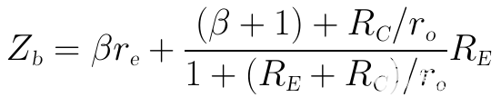 这个就是考虑ro后的纯BJT输入阻抗Zb的表达式。然后再将这个值与RB并联,就可得到最终的输入阻抗Zi的完整表达式: