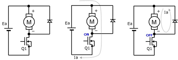 本文将探讨使用1枚MOSFET对有刷直流电机进行PWM驱动时的电机电流和再生电流。有多种方法可以实现电机的PWM驱动,其中包括通过在电机和接地间插入MOSFET来实现开关的简单方法。使用通过在电机和接地间插入MOSFET来实现开关的这种方法时,与电机并联连接的二极管会流过再生电流,本文将介绍流过电机的电机电流与这种再生电流之间的关系。 用1枚MOSFET进行PWM驱动时的电机电流和再生电流首先,我们来看用1枚MOSFET对有刷直流电机进行PWM驱动时的电路和电流路径。