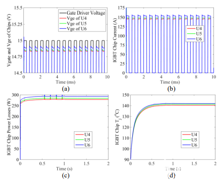 图7:仿真结果(a)芯片的栅极驱动器电压和Vge(b)IGBT芯片电流值(c)IGBT芯片平均总功率损耗(d)IGBT芯片Tj变化。 图7显示了不同条件和温度下的仿真输出,以便进一步了解IGBT及其性能。图中的IGBT芯片U6图11 (a)由于靠近模块封装的栅极控制端子,因此具有最高的Vge值,图7(b)显示了三个并联芯片之间的电流分布。如图所示。如图11所示,芯片U6描述了最高平均总功率损耗(c)和图。如图7所示,Tj随时间的变化(d)。如果IGBT中存在温度不稳定,则可能会出现各种长期问题,这些问题可能会增加功率损耗和热应力。 四、结语 研究了具有EM-电热耦合的IGBT半导体功率模块的行为,以及均流特性和热特性。所进行的仿真结果完全符合预测,使其在各种物理和电子领域进一步扩展。通过获得的结果,可以说揭示IGBT功率模块封装对芯片电热行为的影响的机会更高。随着对该主题的更广泛研究,此类系统甚至可以部署在复杂的设备中并具有增强的可靠性。 |