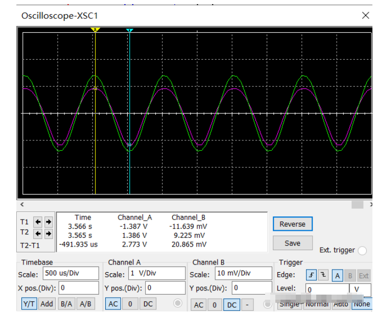 示波器波形图 在很多情况下,信号传输的前后两级间必须是电绝缘的,采用光耦合放大电路就是最好的形式。操作方法同前。示波器调节:X轴扫描为500μS/Div,A通道改为AC模式,Y轴幅度为1V/Div,B通道Y轴幅度为10mV/Div。 (责任编辑:admin) |