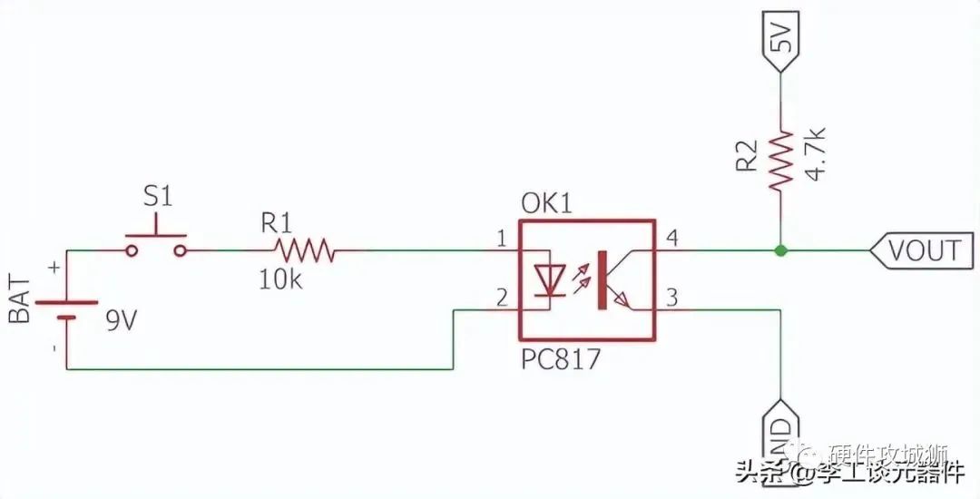 用于开关直流电路的光耦合器 在上面的电路中,使用了基于光电晶体管的光耦合器电路,是一个典型的晶体管开关。 在原理图中,使用了基于低成本光电晶体管的光电耦合器PC817。红外线LED将由 S1 开关控制。当开关打开时,9V 电池电源将通过限流电阻 10k 为 LED 提供电流。强度由 R1 电阻控制。如果我们改变值并降低电阻,LED的强度会很高,使晶体管增益很高。 另一方面,晶体管是由内部红外 LED 控制的光电晶体管,当 LED 发出红外光时,光电晶体管将接触,VOUT 将为 0,关闭连接在其上的负载。根据数据表,晶体管的集电极电流为 50mA,R2 提供 VOUT 5v,R2 是一个上拉电阻。 在这种配置中,基于光电晶体管的光耦合器可以与微控制器一起用于检测脉冲或中断。 2、用于检测交流电压的光耦合器: