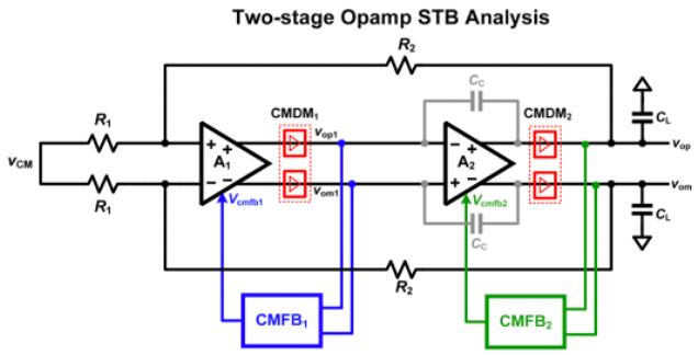 图7 差分输入差分输出闭环负反馈电路 第二种对于图7所示的差分输入差分输出闭环负反馈电路来说,通过从模拟库添加CMDM(-1差分环路增益,1代表共模环路增益)也可以添加diffstbprobe进行stb仿真得出图7所示电路的环路增益和PM判定系统稳定性,其中需要注意的是输入必须加上共模电平使得输入管正确打开工作。