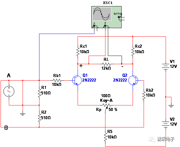 差动放大电路 从昨天的学习,已经看到差动放大电路对零点漂移的抑制能力实际是其对共模信号的抑制能力,它真的能抑制温度漂移吗?请跟我一起看看今天的差动放大电路温度分析: 1、零输入分析 如图所示,为测试差分放大电路在零输入情况下的响应状态,将交流信号源短路接地。