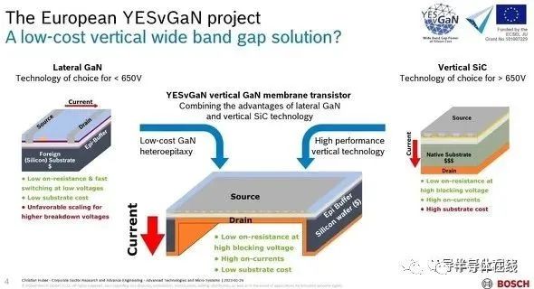 在全球最大的电力电子展 PCIM Europe 2023 上,旨在以类似硅的成本实现垂直 GaN(氮化镓)功率晶体管的欧洲财团 YESvGaN 介绍了其方案。 近年来,SiC(碳化硅)、GaN(氮化镓)等宽带隙(WBG)功率半导体的开发和市场导入速度加快,但与硅相比成本较高的问题依然存在。此外,GaN功率器件分为在硅片上形成GaN活性层的“水平型”和直接使用GaN衬底的“垂直型”。使用硅片的卧式可以以较低的成本获得GaN的高频特性,但不适合需要650V以上的高耐压的情况。另一方面,垂直型比水平型更适合高电压和大电流,但GaN晶圆价格昂贵,直径小,约为2至4英寸。 YESvGaN 是一项于 2021 年启动的欧洲研究项目,旨在通过展示一种新型垂直 GaN 功率晶体管来解决这些问题,该晶体管以与硅相当的成本实现垂直 WGB 晶体管的性能。YESvGaN 联盟总部位于七个国家,包括罗伯特博世、意法半导体、Soitec、Siltronic、AIXTRON、X-FAB、德国研究机构 Fraunhofer IISB、费迪南德布劳恩研究所、比利时根特大学和德国大学等公司。西班牙巴伦西亚23。它由公司/组织组成,由欧盟研发计划“ECSEL JU”和欧洲国家资助。 该研究正朝着实现两种垂直特性的方向进行,同时获得在硅或蓝宝石衬底上异质外延生长 GaN 的成本优势。 之所以不能采用GaN on Silicon(在硅衬底上生长GaN),首先是因为它需要绝缘缓冲层。蓝宝石本身也是绝缘体。因此,该项目正在着手开发一种“垂直 GaN 薄膜晶体管”,它在 GaN 生长后去除器件区域正下方的缓冲层、硅和蓝宝石衬底本身,并从背面直接连接到 GaN 层金属触点。目标是使用最大300mm的硅或蓝宝石晶圆实现耐压为650~1200V级的纵型GaN功率晶体管。据称可以兼顾低成本和高耐压。