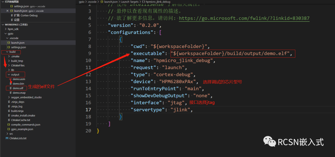 配置: { // 使用 IntelliSense 了解相关属性。 // 悬停以查看现有属性的描述。 // 欲了解更多信息,请访问: https://go.microsoft.com/fwlink/?linkid=830387 "version": "0.2.0", "configurations": [ { "cwd": "${workspaceFolder}", "executable": "${workspaceFolder}/build/output/demo.elf", "name": "hpmicro_jlink_debug", "request": "launch", "type": "cortex-debug", "device": "HPM6280xPAx", "runToEntryPoint": "main", "showDevDebugOutput": "none", "interface": "jtag", "servertype": "jlink", } ]} 5、对于openocd配置如下:需要指定openocd的配置文件路径,比如probes、soc、boards的cfg文件