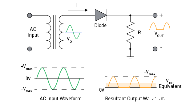 Figure 2: Digression: The efficiency of a half-wave diode rectifier 假设抵抗者R对面的峰顶电压是Vmax. DC平均电压计算如下: 因此: AC 电路中的rms 电流以这种方式计算: 输入的 AC 功率和输出 DC 功率等于 : 此处: RS- 变压器二级刮风阻力 rD- 装载二极管阻力 R - 抗负负载 半波校正器的效率定义为负载与输入AC电源的DC功率比率: $$eta = frac{P_{dc}}{P_{ac}} = frac{I_{dc}^{2} cdot R}{I_{rms}^{2} cdot (R_s + r_D + R)} approx frac{I_{dc}^{2} cdot R}{I_{rms}^{2} cdot R} = left(frac{I_{max}}{pi}right)^{2} left(frac{2}{I_{max}}right)^{2} = frac{4}{pi^{2}} = 40.53%$$ 尽管效率低,波纹电压高,但单阶段半波整流器在小型电力供应或电路中有一些应用,在这些电路中,低成本至关重要,产出波纹电压可以容忍。 Three-Phase Half-Wave Rectifiers 三阶段半波校正装置用于电力电子应用,需要将三阶段空调功率转换为DC功率,比单阶段功率要高,因为使用了AC功率的所有三个阶段,但DC电压的输出仍经历电压,需要额外过滤,以实现稳定的DC电压。 三阶段半波校正装置的优点是简单,因为它只需要三个二极管,但其输出电压低于其他类型的校正装置,因为三个阶段中只有一个阶段是一次使用的。