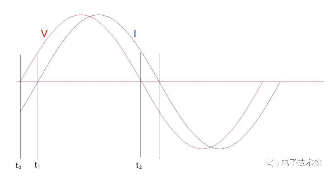 从 t0 到 t1,电流为电抗性,二极管传导电流。