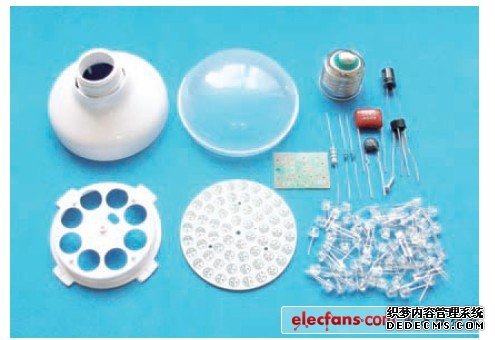 图3 有60+2 只,其中2 只是备件。焊装LED 的圆形印板的元件面加涂了白色漆,可以增加反光效果。为方便用户制作,套件出厂时已将螺纹口内部的220V引线通过专用工具压接好,可以避免该引线脱落而引发意外。