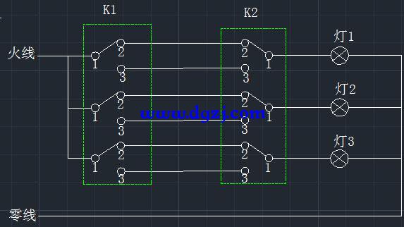 如果卧室的灯还需在客厅来控时,这时卧室的灯就是三地来控制,在上图两单联单刀双控开关之间串联一个单联双刀双控开关如下图所示:K1和K3是两个单联单刀双控开关,K2是一个单联双刀双控开关,K2的双刀的动作是同步的要1和2接通时两刀全是1和2接通、要1和3接通时两刀全是1和3接通,K2与K1和K3串联在一起、不管三个开关各自在任何位置均可独立控制卧室灯的开关状态,从而实现三地控制。如果在K1与K3之间串联N个单联双刀双控开关则可实现对灯N+2个不同地方控制。