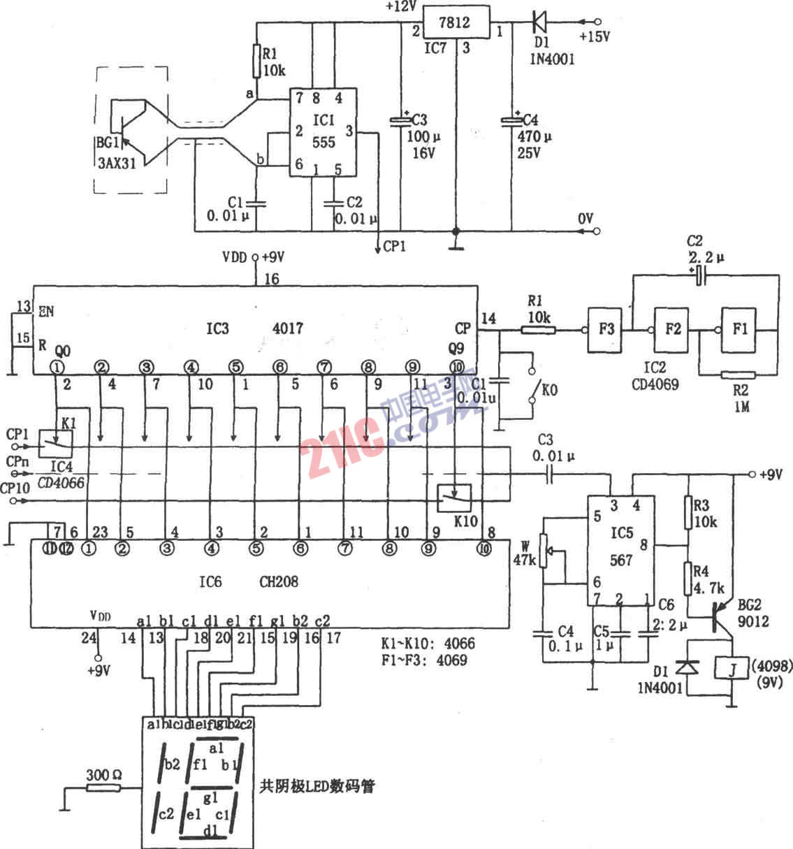 如图所示为十路温度巡回检测电路。该检测电路由温度传感器、V/F转换电路、振荡器、巡回检测程序控制、报警、译码显示电路等组成。 温度传感器采用3AX31,且接成二极管形式。当环境温度变化时,其射-集间的电阻k随温度呈线性变化。振荡器由IC1(555)和rce、R1、C1等组成,其振荡频率为f=1.44/(R1+2rce)C1,故rce随温度呈线性变化,则f也相应成比例地变化,从而实现温度/频率的转换。若检测10个点,则需10个这样的温度/频率转换头。电路中IC2采用六反相器CD4069,其中F1、F2、F3组成0.2Hz的触发脉冲发生器,即每5秒向计数电路IC3送一个计数脉冲CP。IC3为十进制计数器/脉冲分配器CD4017,在CP作用下,其十个输出端Q0~Q9依次出现高电平脉冲。相应使模拟电子开关K1~K10依次导通。模拟开关IC4采用CD4066,由K1~K10输出的频率信号依次送入具有锁相环回路的音频译码器IC5(567)③脚(其中IC5的中心频率为f0=1/1.1RwC4,电路中的C5可调定锁定带宽),当某一路温度超过限定范围,且与预置的中心频率f0相同时,则IC5输出低电平(自⑧脚),使BG导通,继电器J吸合,触发报警电路工作,发出报警葸响。与此同时,IC3的Q0~Q9输出的高电平信号又依次送入IC6(CH208)译码显示电路,经IC6译码后输出相应的字段信号,驱动共阴极数码管LED工作,使其显示出相应的超温场点。本检测电路适用于机组、列车轴温等多点检测的场合。
