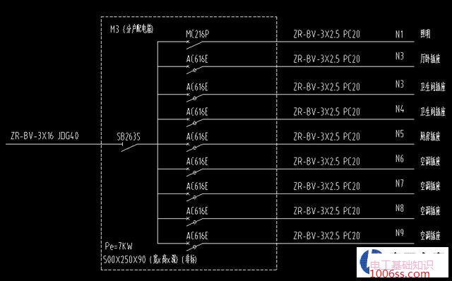 家庭配电如何才能安全、经济、合理的设计 首先要统计室内所有电器设备的功率(按最高功率),以及划分电器设备要安装的位置。一般家用大功率设备有电磁炉,热水器,空调(3P以上),烤箱等等。这些设备都需要配备16安的三孔插座面板。 如果大功率设备特别多,也需要专业电工多下几趟电路回路。一般商业住房电路分为如下回路:全屋照明,室内插座(空调单独电路),卫生间,厨房(卫生间厨房都是单独的电路)。 第一步要做的是对家里的配电进行回路的划分 下图是一套三室两卫两厅的户型,开发商交房时设计的电路,共计设计9个回路: 回路N1是照明,BV3×2.5 铜线; 回路N2是厅、卧室插座,BV3×2.5 铜线; 回路N3和N4是两个卫生间插座,BV3×2.5 铜线; 回路N5是厨房插座,BV3×2.5 铜线; 回路N6、N7、N8、N9是四个空调的插座,BV3×2.5 铜线; 开发商的这种设计显然我们使用时很不合理,下面电工之家给大家重新布置回路,共计分为10各回路: 回路1是照明,BV3×2.5 铜线; 回路2是厅插座,BV3×2.5 铜线; 回路3是卧室插座,BV3×2.5 铜线; 回路4和5是两个卫生间插座,BV3×4 铜线; 回路6是厨房插座,BV3×4 铜线; 回路7是厅空调插座,BV3×4 铜线; 回路8、9、10是三个空调的插座,BV3×2.5 铜线; 第二步是布置用电点位,布置图见下图 我们要根据自己家庭的用电情况和用电习惯,合理布置所有用电点位; 用电点位布置时,我们要分房间逐一进行,灯、插座、开关等要考虑仔细,记得多留一到两个备用插座。 第三步是布置线路的走向,布置图见下图 线路走向布置时,首先坚持的基本原则是走天不走地,尽量沿墙面和顶板布置电路; 如果家中不吊顶,那么线路只能走地,建议大家线管走地时不要密集布置,要留有间隙,否则会导致地砖空鼓。 通过三个步骤即用电回路的划分、用点点位的布置、用电线路的布置,给大家分析了如何能够实现家居配电的安全、经济、合理;大家按照电工之家的建议去做,一定可以实现家居配电的完美设计。