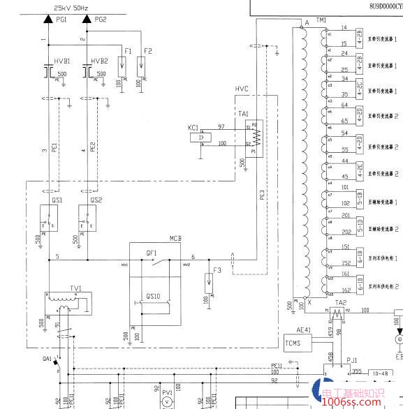 和谐电力机车的主电路图 电气化铁路的回路就是火车脚下的铁路(钢轨)。 机车先通过电弓从接触网(就是天上的电线)上受电,在经过机车上的牵引变压器,整流柜,逆变,然后传入牵引电机带动机车,最后通过车轮传入钢轨。形成一个巧妙的电路。 火车上面的一根线是正线(AC25KV) ,要想有电流就要构成回路,在牵引变电所把负线就接到了钢轨上,钢轨就是机车的负极了,所以当机车工作时由25KV的交流电最终是回到钢轨上的。 上面是某和谐机车的主电路图,25KV交流电经受电弓,高压电压互感器,主断路器,隔离开关进入主变压器原边,经过主变压器降压,次边输出2000v左右的交流电,进入整流,斩波,逆变模块最后输出三相交流电给驱动端的三相电机供电,6轴机车或者8轴机车的间隔车轴的端部是由接地回流刷的,用以主电路的回流。注意区分回流跟接地的区别,虽然都接钢轨,但作用不同。