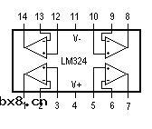 LM324是四运放集成电路,它采用14脚双列直插塑料封装,外形如图所示。它的内部包含四组形式完全相同的运算放大器, 除电源共用外,四组运放相互独立。每一组运算放大器可用图1所示的符号来表示,它有5个引出脚,其中“+”、“-”为两个信号输入端,“V+”、“V-”为正、负电源端,“Vo”为输出端。两个信号输入端中,Vi-(-)为反相输入端,表示运放输出端Vo的信号与该输入端的位相反;Vi+(+)为同相输入端,表示运放输出端Vo的信号与该输入端的相位相同。LM324的 引脚排列见图2