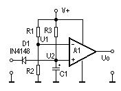 如果将二极管D1去掉,则此电路具有加电延时功能。刚加电时,U1>U2,运放A1输出低电平,随着电容C1不断充电,U2不断升高,当U2>U1时,A1输出才变为高电平。