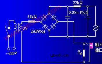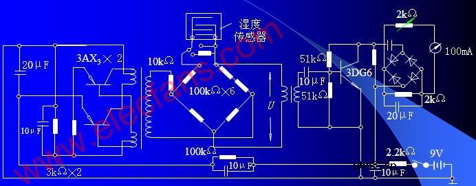 欧姆定律电路 此电路适用于可以流经较大电流的陶瓷湿度传感器。由于测湿电路可以获得较强信号,故可以省去电桥和放大器,可以用市电作为电源,只要用降压变压器即可。其电路图如图。
