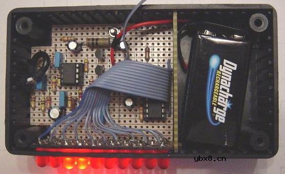音量指示器--Sound Level Indicator This project uses an LM3915 bar-graph IC driving two sets of ten LEDs for a 30dB range. The circuit is unique because it has an additional range of 20dB provided by