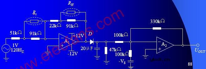 带温度补偿的湿度测量电路 在实际应用中,需要同时考虑对湿度传感器进行线性处理和温度补偿,常常采用运算放大器构成湿度测量电路。下图为湿度测量电路中Rt是热敏电阻器(20kΩ,B=4100K);RH为H204C湿度传感器